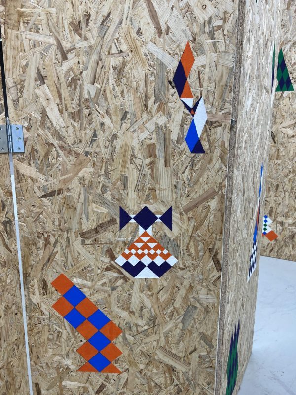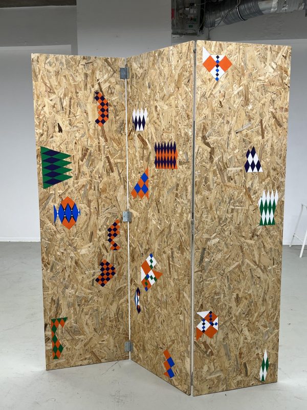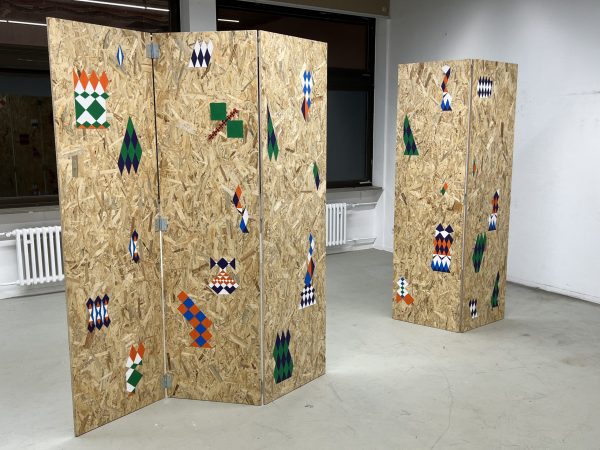cultural folding, 2022, OSB-Platten, Acryl auf Leinwandstoff, Metallschaniere, Schrauben