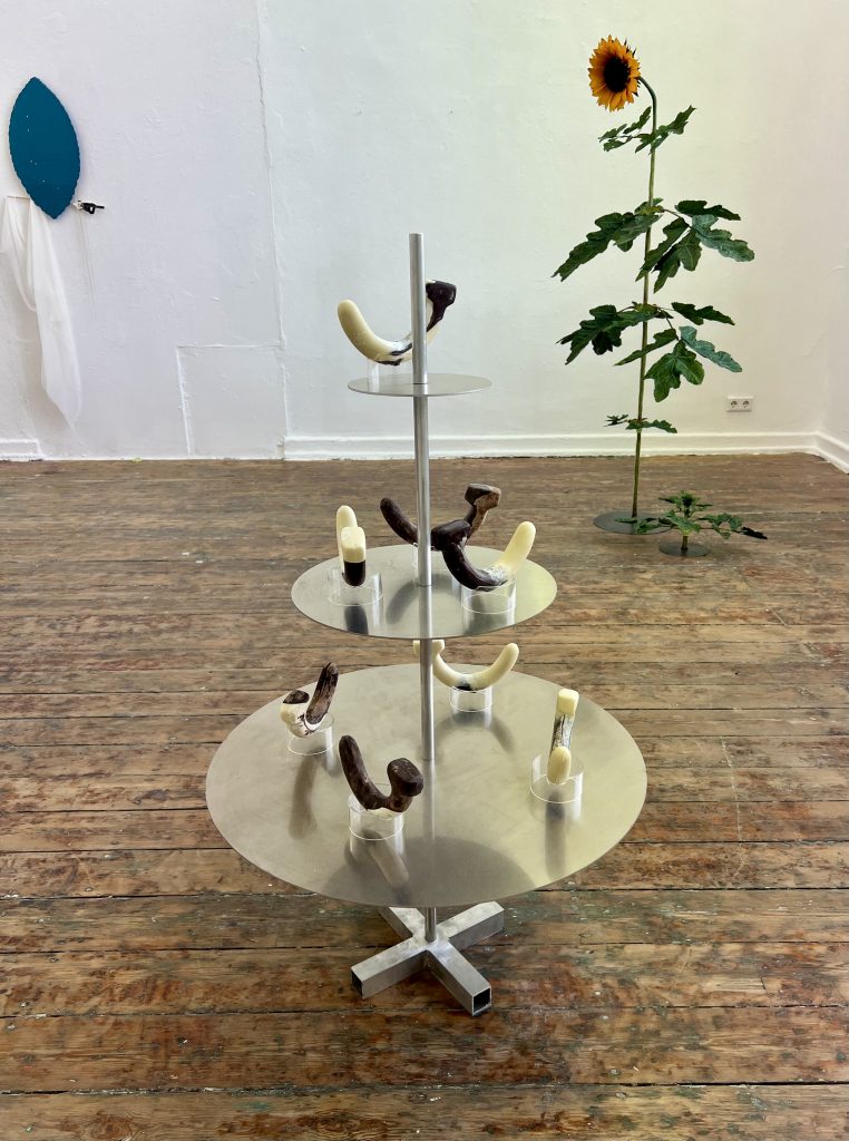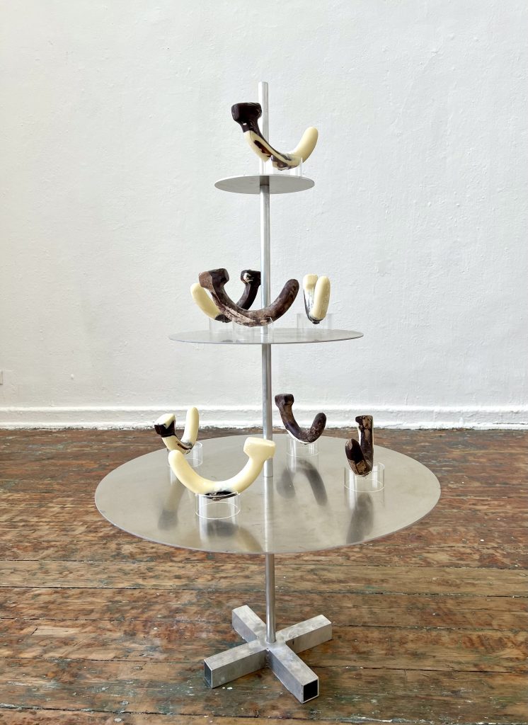 Schokoladenderivate, 2026, Aluminium, Plexiglas, weiße und schwarze Schokolade, 70x70x125 cm, Rundgang Kunstakademie Düsseldorf